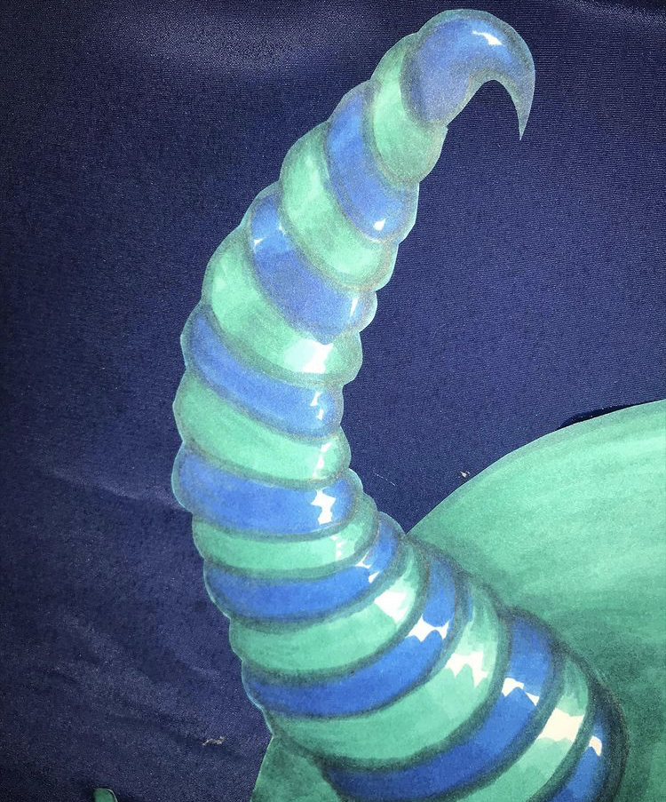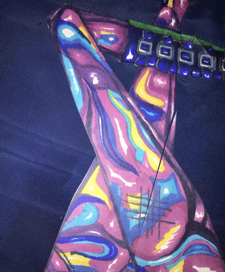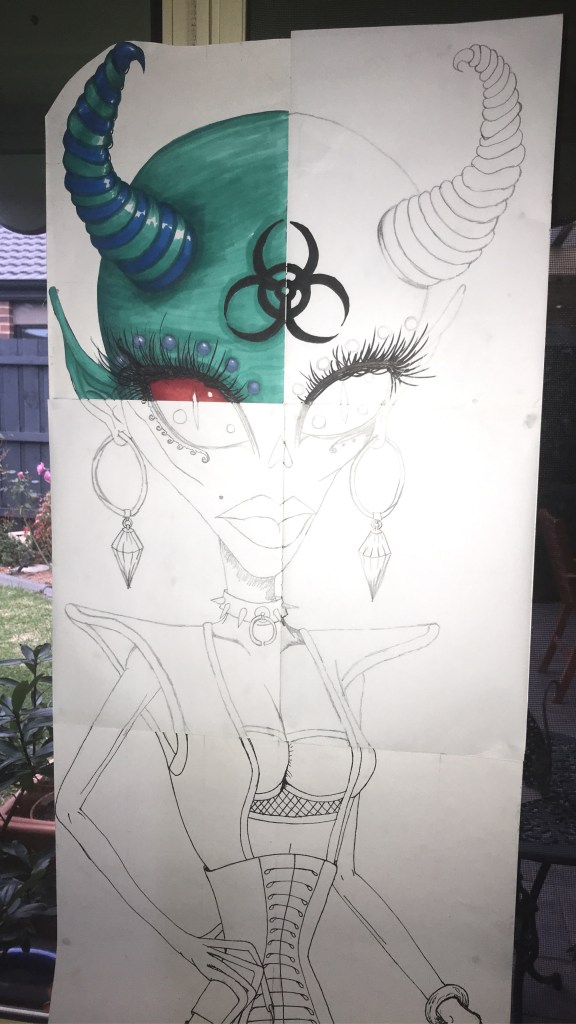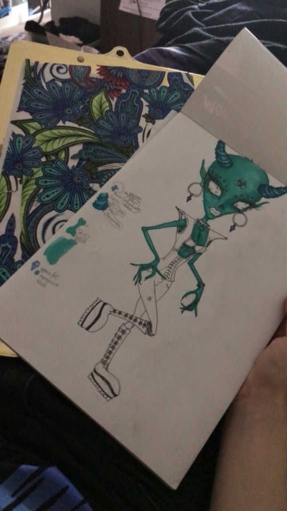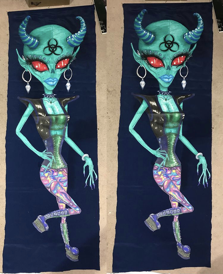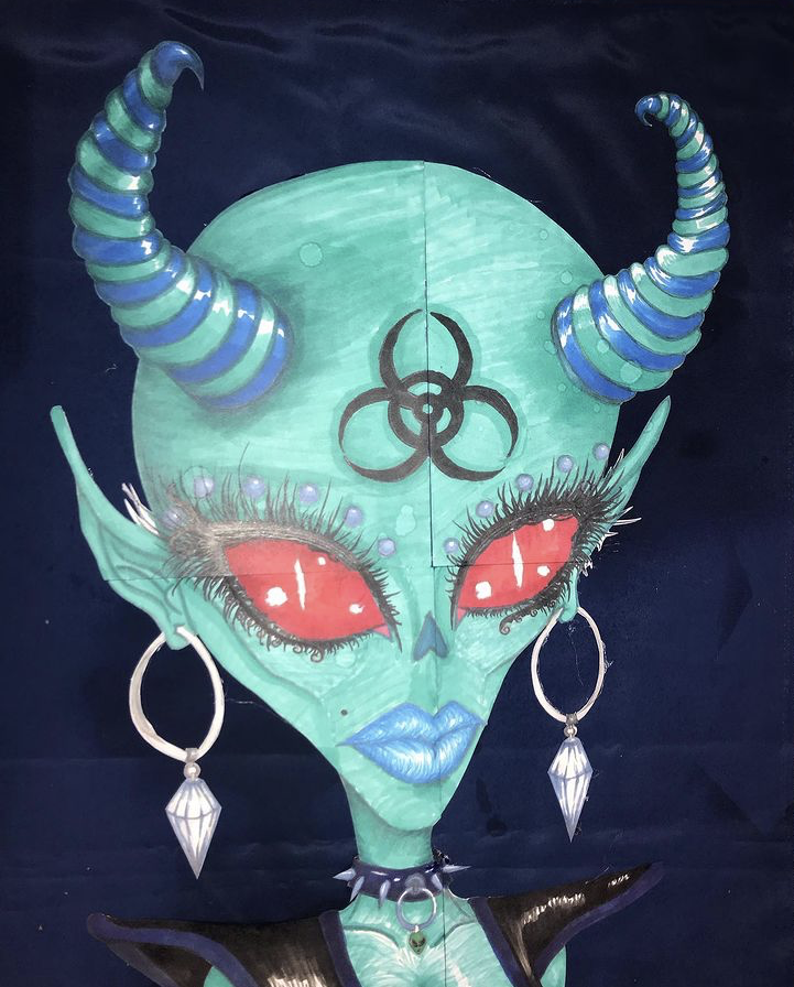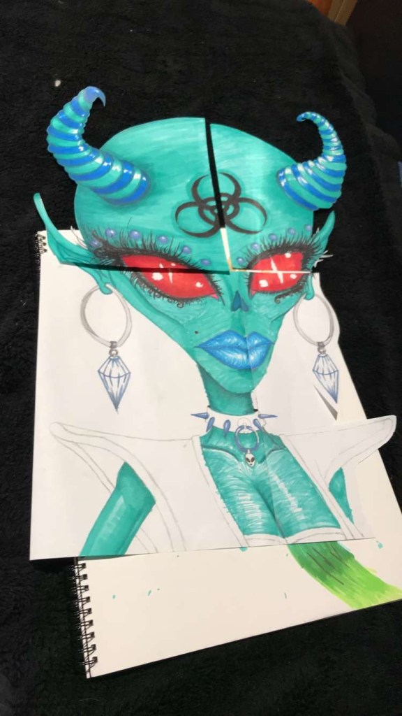 My words: “an alien cybergoth drag queen”. Need I say any more? Created with fine liner and Copic markers, mounted on polyester fabric.