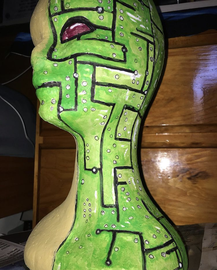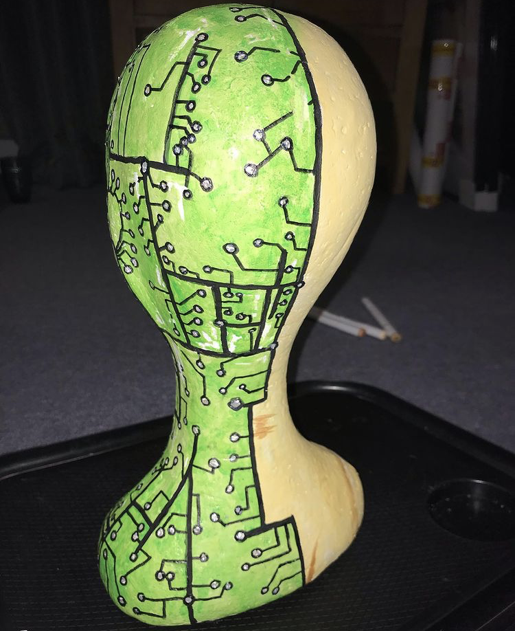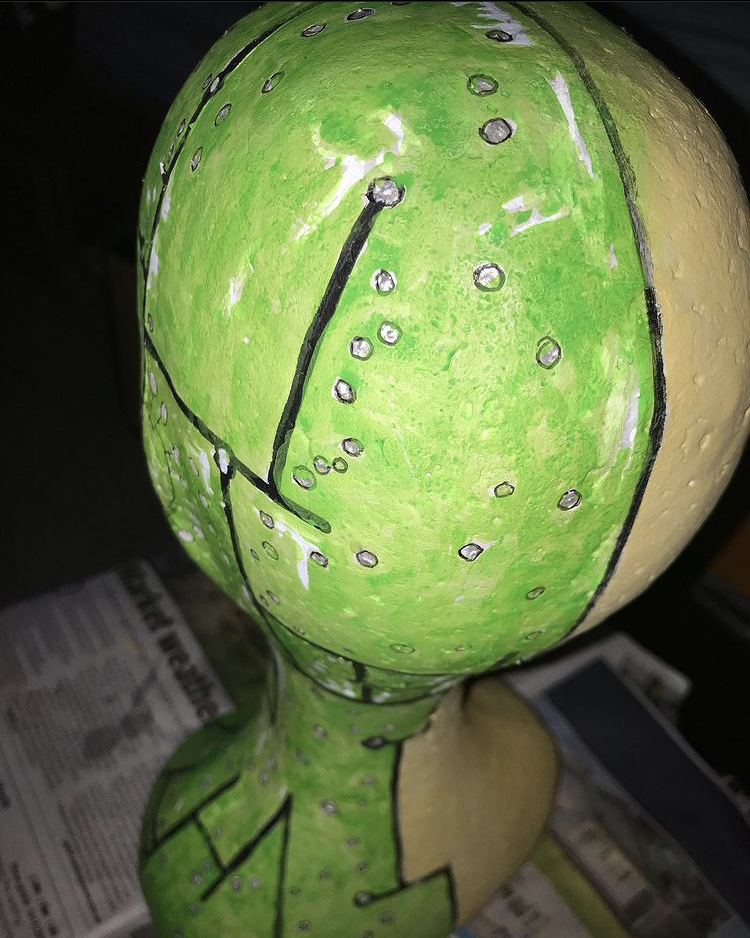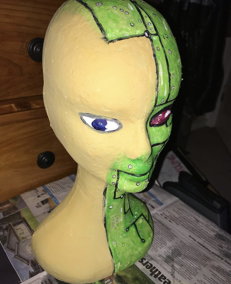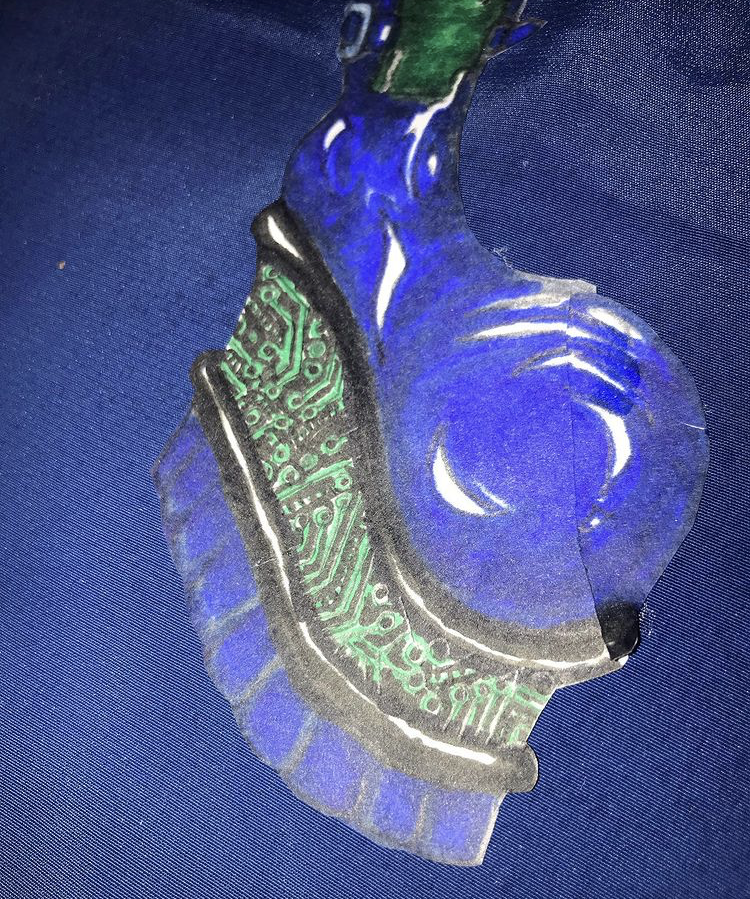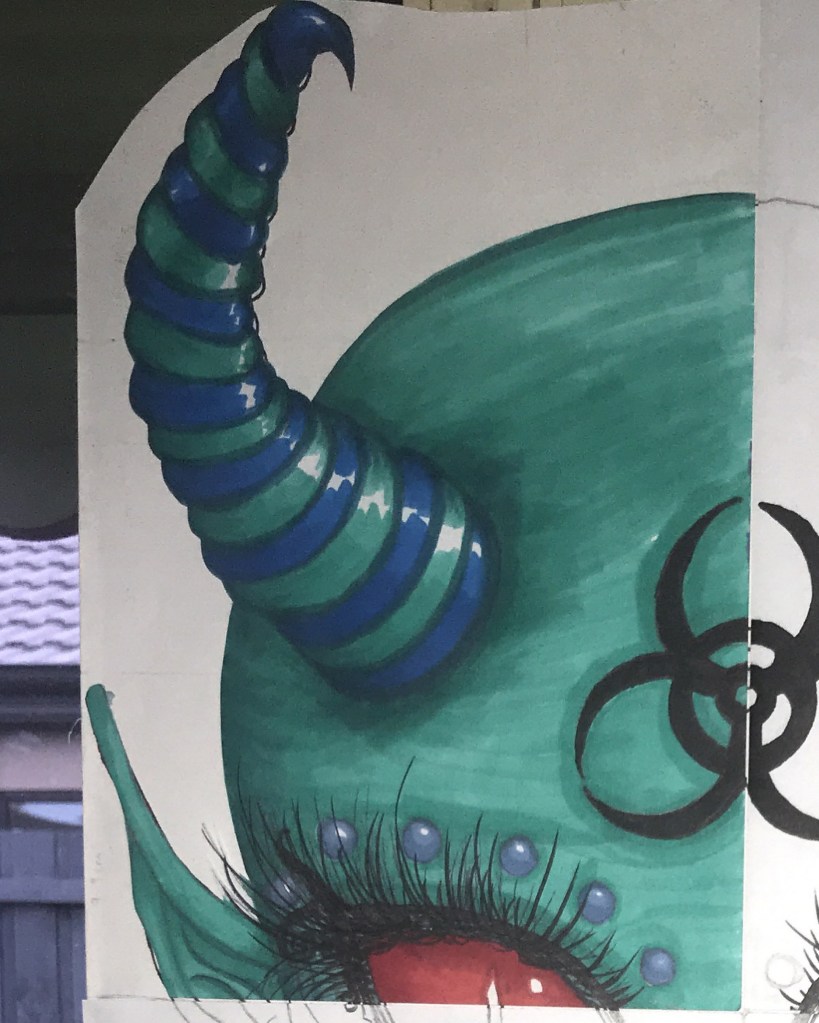 My words: “an alien cybergoth drag queen”. Need I say any more? Created with fine liner and Copic markers, mounted on polyester fabric.
