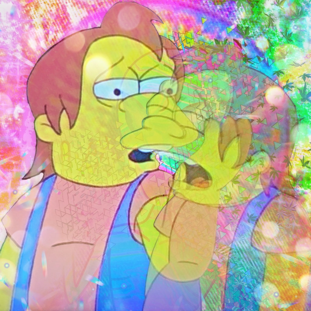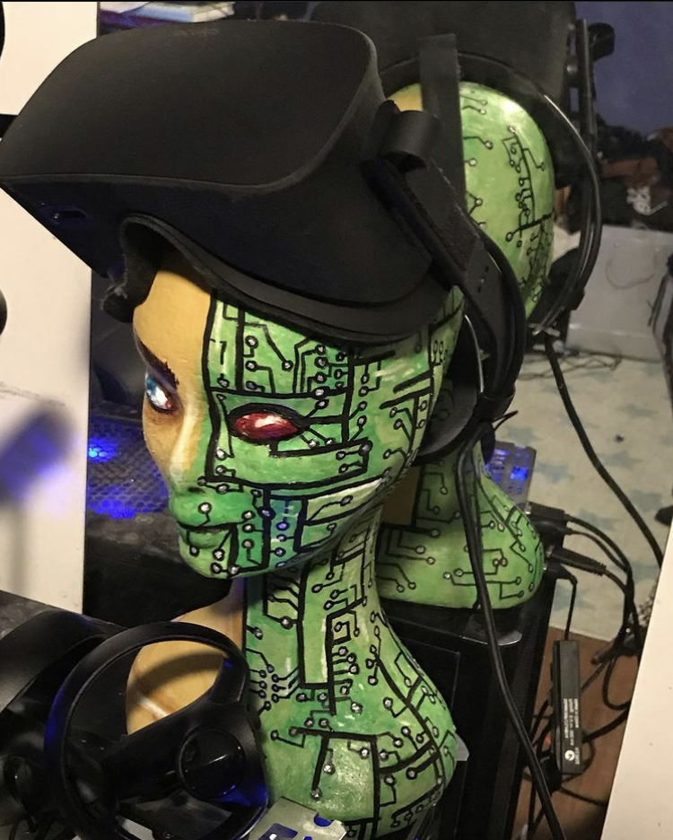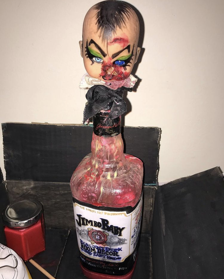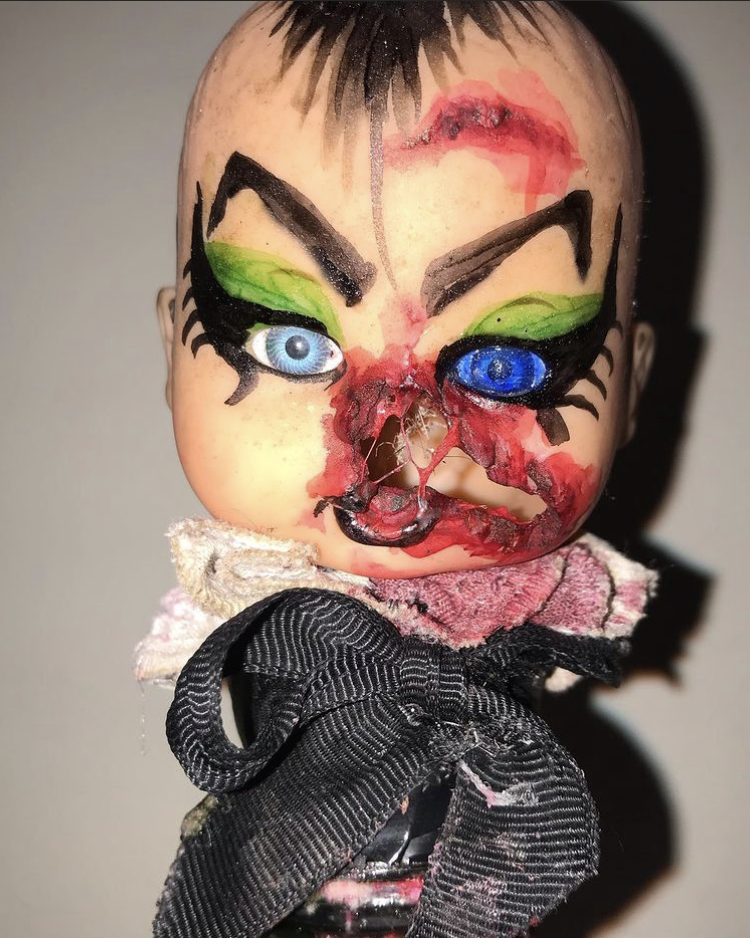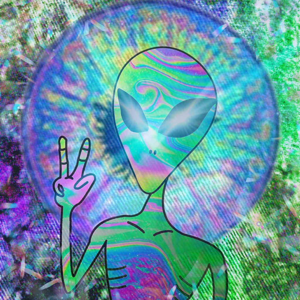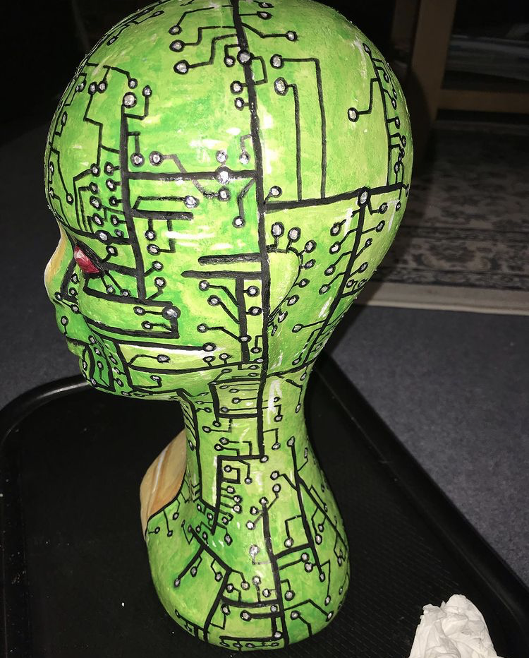 My words: “an alien cybergoth drag queen”. Need I say any more? Created with fine liner and Copic markers, mounted on polyester fabric.